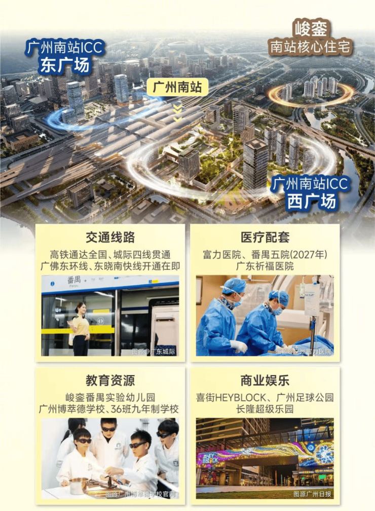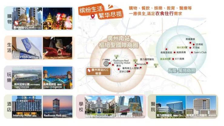 项目周边商业配套丰富多样,满足居住者全方位的生活需求。位于南站东广场的 ICC mall 商场预计 2026 年开业,将为业主带来一站式的购物、娱乐、餐饮体验。2 站地铁可达中国最大的广州足球公园,预计 2026 年启用,让业主在家门口就能观看精彩赛事。4 站地铁可通广州最受欢迎的长隆旅游度假区,为家庭休闲娱乐提供好去处。5 站地铁可达万博商圈,进一步丰富了商业选择。此外,新鸿基地产在商业运营方面实力超群,写字楼招商团队能吸引众多跨国企业、金融机构和其他大型企业入驻,商场、酒店实现 100%自持,为业主营造浓厚的商业氛围,提供便捷的生活服务。