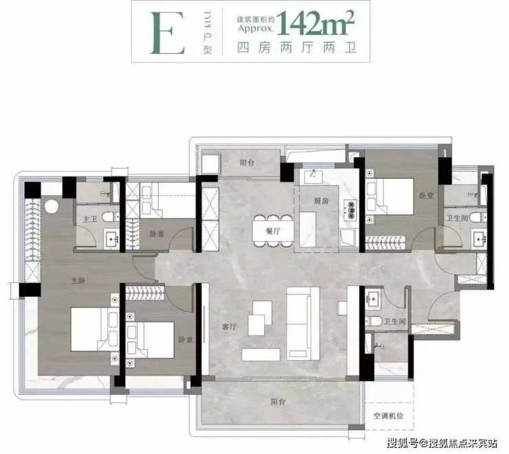 建面约142㎡户型,标准的横厅布局,双主套,南北双阳台,南向大面宽,户型没啥缺点。