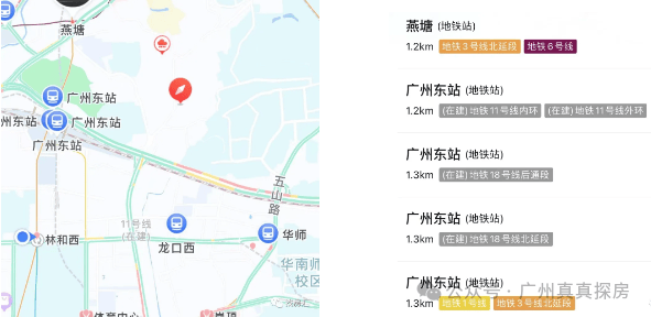 地块属于无地铁状态,到最近的地铁L3-燕塘、L1-广州东、L3-五山,步行距离至少1.8km;其次,上下班高峰期,东莞庄路+天寿路是拥堵黑点,小区门口就是东莞庄路,好在去年世纪金源对周边路况进行改善,版块无地铁预期,劝退不少非五山教职工买家。总而言之,这个板块就不适合朝九晚五通勤的小伙伴。
