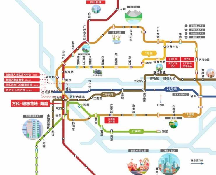 地铁:距离1号线花地湾站约800米,步行可达;未来还将接入地铁25号线(规划中)、22号线(在建)以及28号线(规划中)。便捷连接至珠江新城等核心商务区。