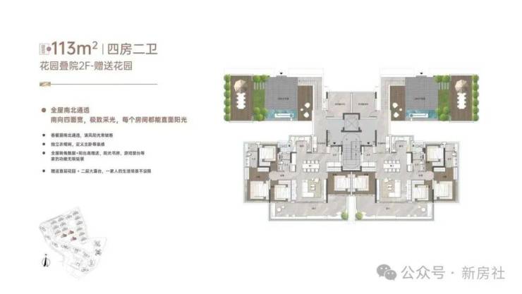 “玥境”为滨江小叠院,主打112-130㎡低密叠院,最大亮点是超高赠送率,1F、2F户型赠送私属花园,3F赠送超大景观露台,4F复式设计,赠送顶层天台。