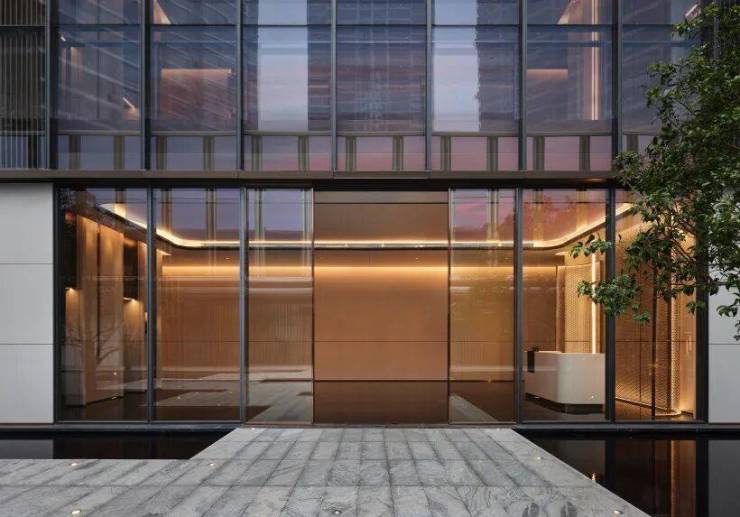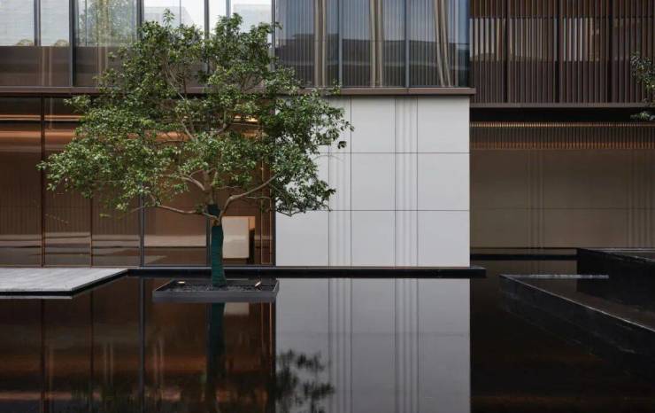 廊道高低错落、蜿蜒穿梭,格栅层叠如林,行至此间豁然开朗,泗水归堂的形制铺展眼前,阔池映天、高树蔽日,尽可静坐慢赏云卷云舒。设计以 “流通空间” 为核心理念,实现室内空间与庭院景致的无界对话,让室外风光自然渗透室内肌理;连廊细节精工雕琢,百叶装置可开可合,营造出丰富多变的空间体验,尽显项目的精致格调。