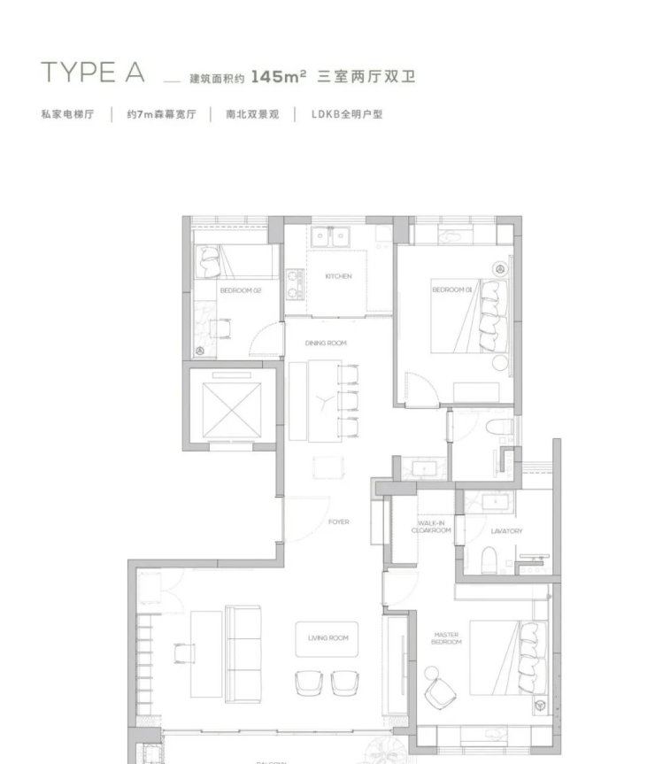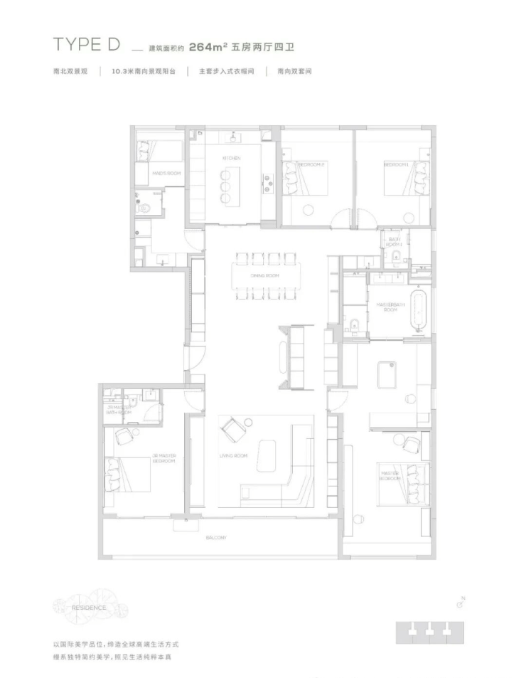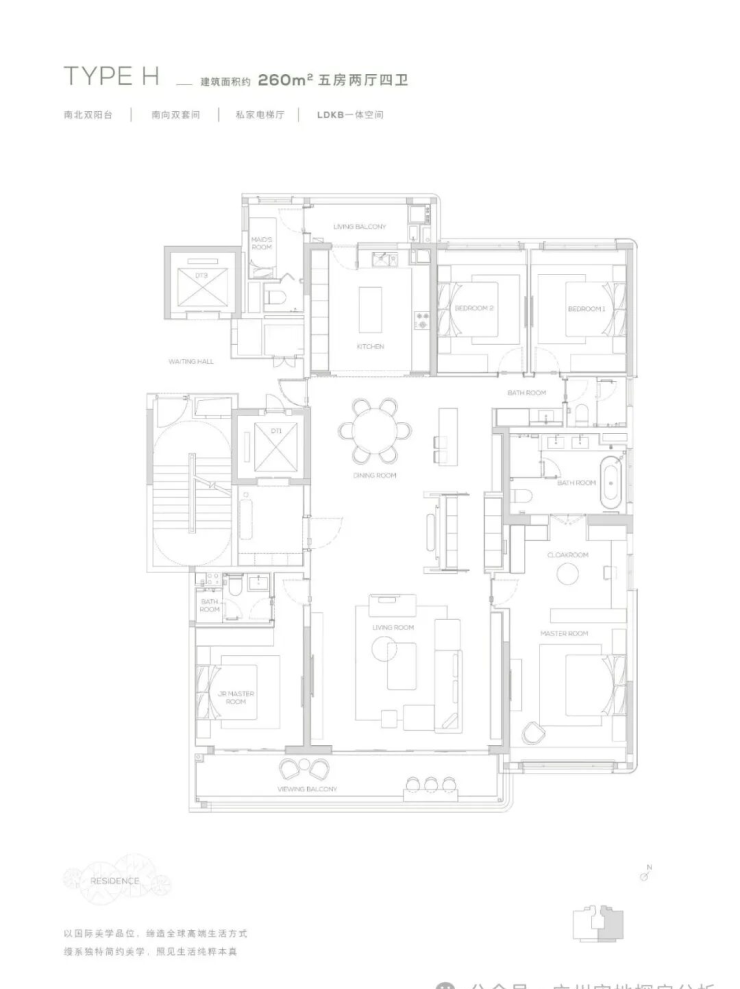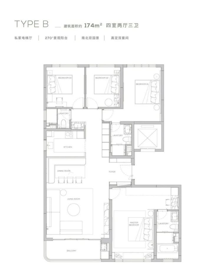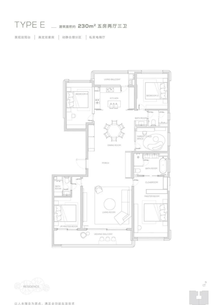 3、产品设计高端,采用板式小高层设计,专梯专户,私家电梯厅保障隐私;户型面积从145㎡起最大达315㎡,空间布局灵活,部分户型配备270°环幕阳台、巨幕宽厅等,满足高端居住需求。