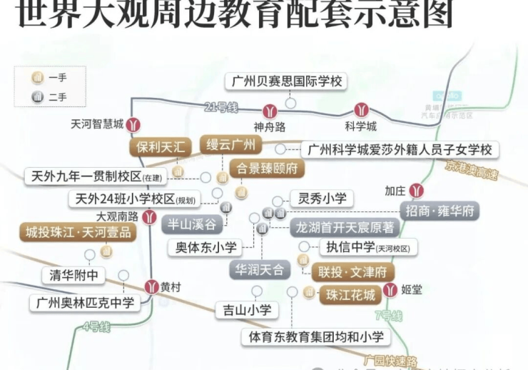2、教育配套优质,社区内自建12年公立教育体系,引入天河外国语学校集团办学,涵盖幼儿园至初中,周边还有清华附中、执信中学等6所名校,教育资源集中。