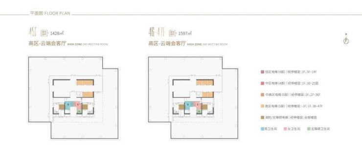38-44F,是企业会客厅,约338-479㎡,45-47F,约1427-1596㎡(整层)
