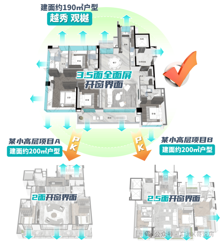 户型三开间朝南,为了获取更大面宽视野,项目还将全屋的窗地比做到38%。