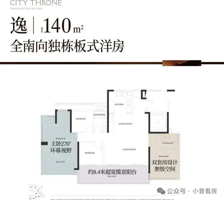 约8.4米南向巨幕阳台,主卧270°飘窗,能最大程度引园景入室。