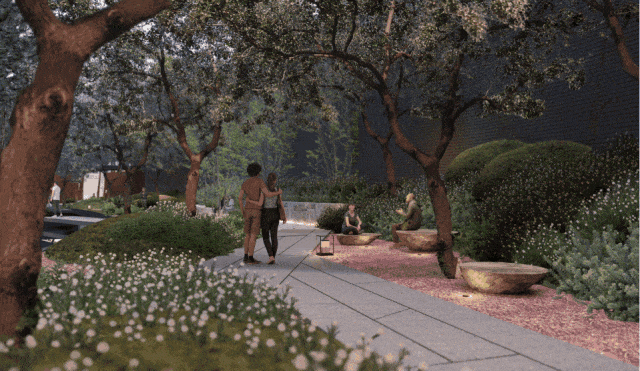 空间色彩、材质肌理以及植物皆是精挑细选,例如园内荔枝树、“荔枝”座椅就极具特色,不仅赏心悦目,还可以在这里戏水赏鱼、休憩互动,全年龄段业主都找到游玩乐趣。
