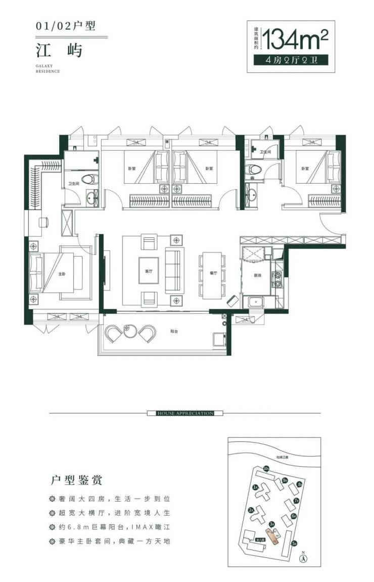 奢阔大四房,生活一步到位;超开阔横厅设计,进阶宽境人生;约6.8米巨幕阳台,IMAX瞰江;豪华主卧套间,典藏一方天地。