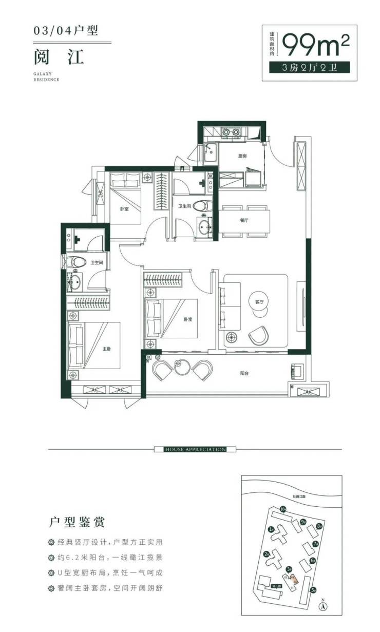 经典竖厅设计,户型方正实用;约6.2米阳台,一线瞰江揽景;U型宽厨布局,烹饪一气呵成;奢阔主卧套房,空间开阔朗舒。