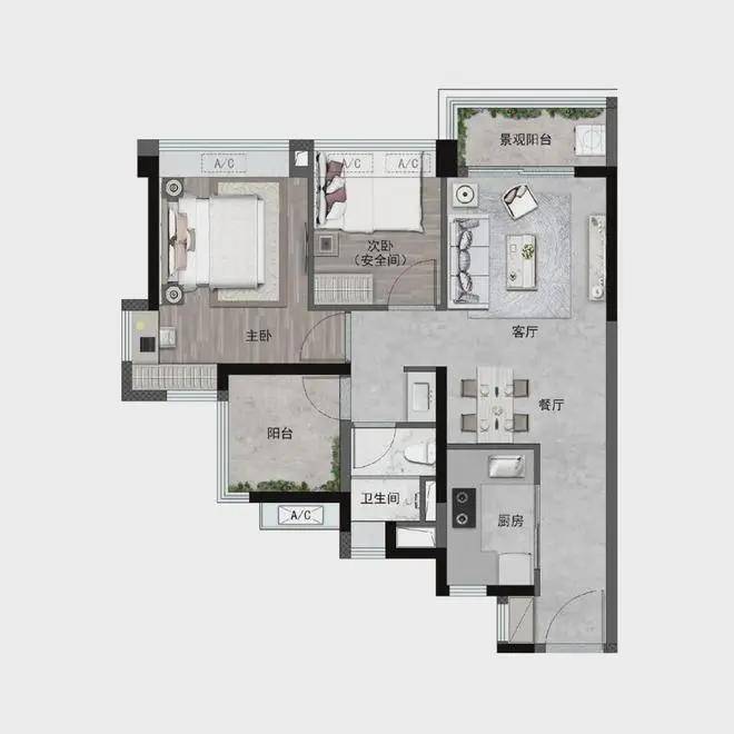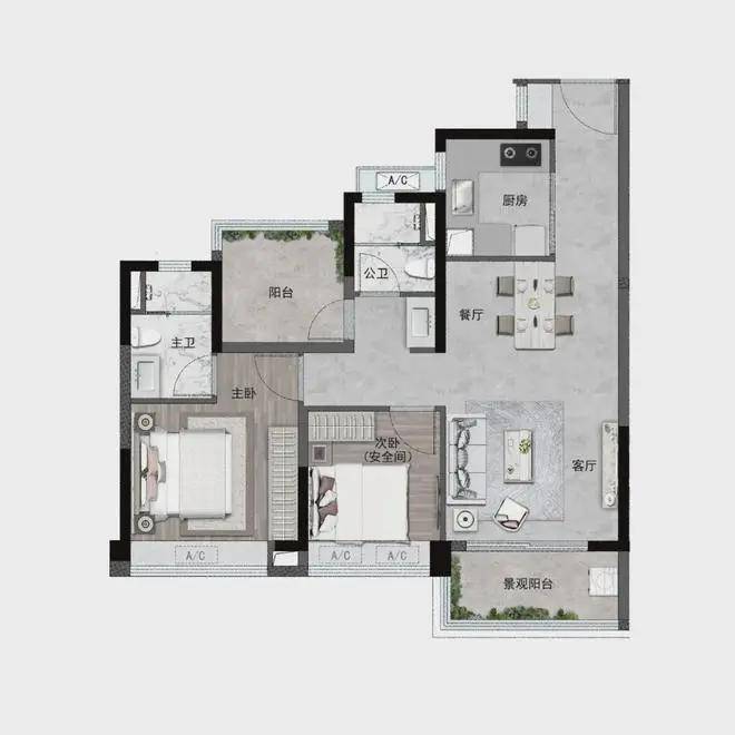 全屋多达6处飘窗赠送,主卧正面飘窗+转角飘窗、玄关飘窗、次卧飘窗、公卫飘窗