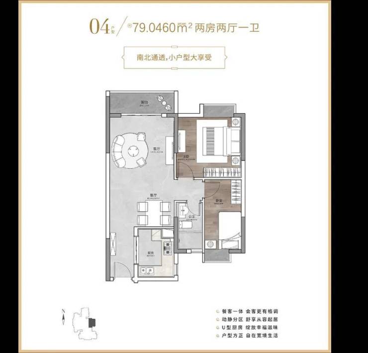 79㎡的 2 室 1 厅是刚需热门,总价大概 300 万元,得房率能到 82%,主卧带 270° 转角飘窗,采光不错,南向的朝向也让房间冬天更暖和,客厅和卧室的空间分配比较均衡,不会显得局促。