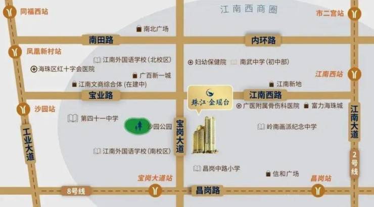 交通出行是这个楼盘的一大优势。距离地铁 8 号线宝岗大道站只有 280 米,步行 5 分钟就能到,坐 1 站到昌岗站还能换乘 2 号线,去广州火车站、海珠广场都很方便;距离 2 号线江南西站也才 800 米,步行 10 分钟左右,通过地铁去琶洲商务区、珠江新城通勤都不算远。