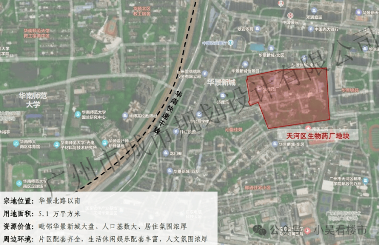 这块地位于华景新城板块,地块很大,占地约5.1万方了,不过四周基本都被华景新城二手房包围住了,这个板块已经20年没有供应了,稀缺性非常高,板块内唯一在售新盘就是广园北边的保利天瑞了,目前也是剩下尾货在卖,生物药厂这块地位置会更好点。