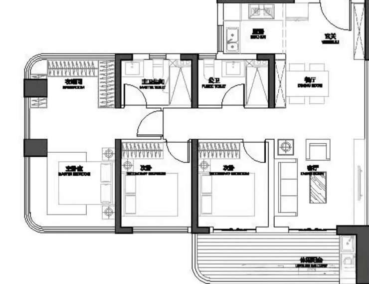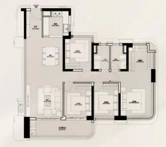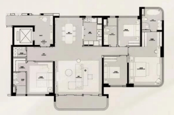 建面约140㎡的四房两厅三卫,独立电梯间,双主卧套房。