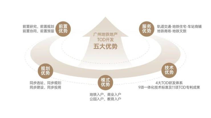 作为城市轨道网络的构建者,广州地铁地产拥有独一无二的视角与能力,形成自身特有的TOD开发五大核心优势:前置优势、规划优势、模式优势、技术优势、服务优势。