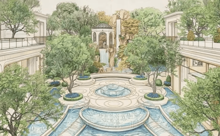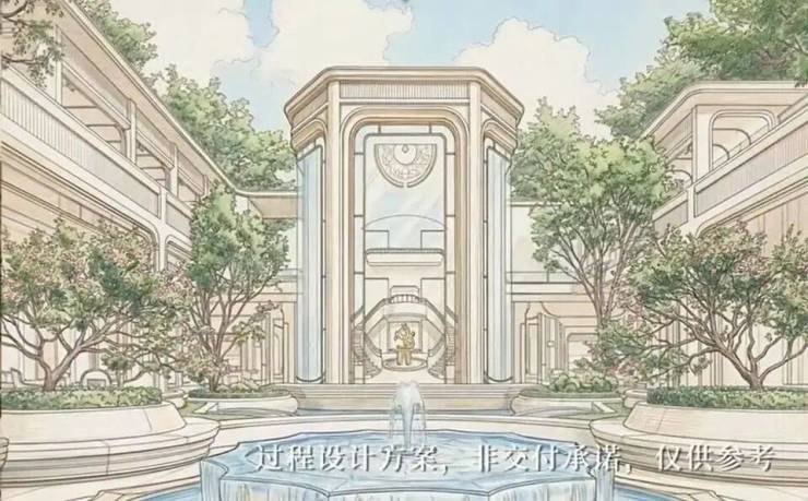 街角公园、水晶光厅、骑楼商业、奢阔门楼一字排开。