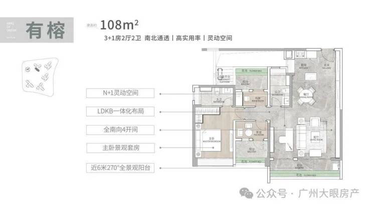 建面108平3+1房,四开间朝南,近6米的南向阳台,270度景观,LDKB一体化设计,5.9米的大方厅,奢阔大主套设计,配置南向大飘窗,独立卫浴,L型衣帽间