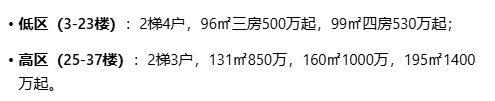 目前清盘仅余 5 套,96 方 500 万起、99 平四房 530 万起,对比高区 131 方 850 万的价格,小户型清盘价堪称捡漏。