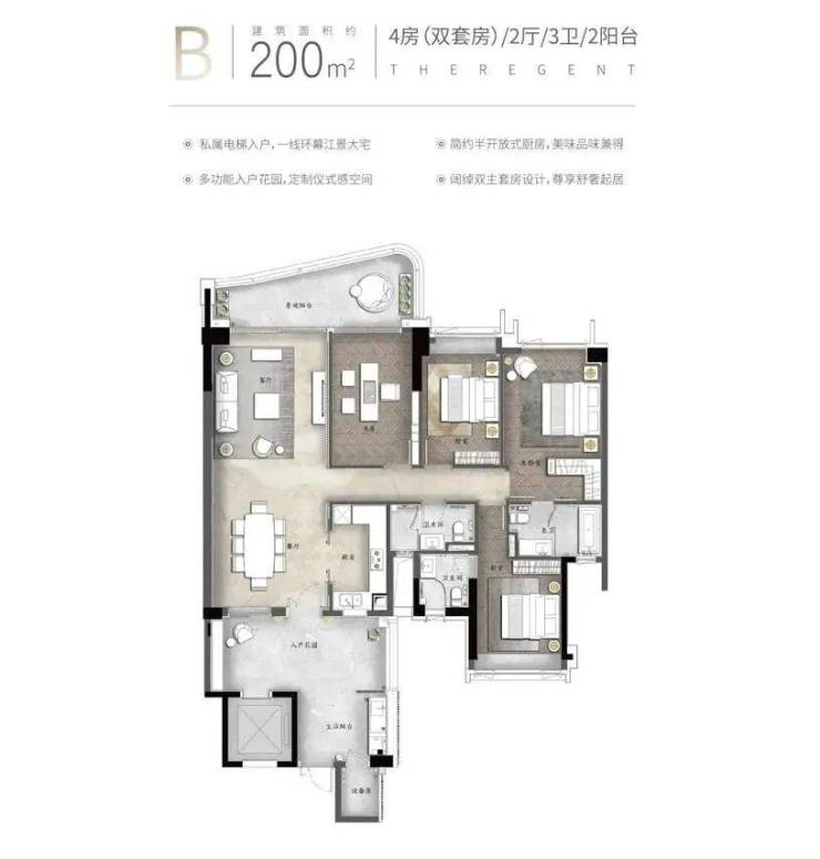 项目特邀三大全球知名设计大师倾情巨献,他们以卓越的创意与精湛的技艺,精心雕琢每一处细节。同时,配备12大国际一线品牌交标,彰显奢华与品质。专梯专户的设计,搭配四房双套房的格局,尽显私密与尊崇。