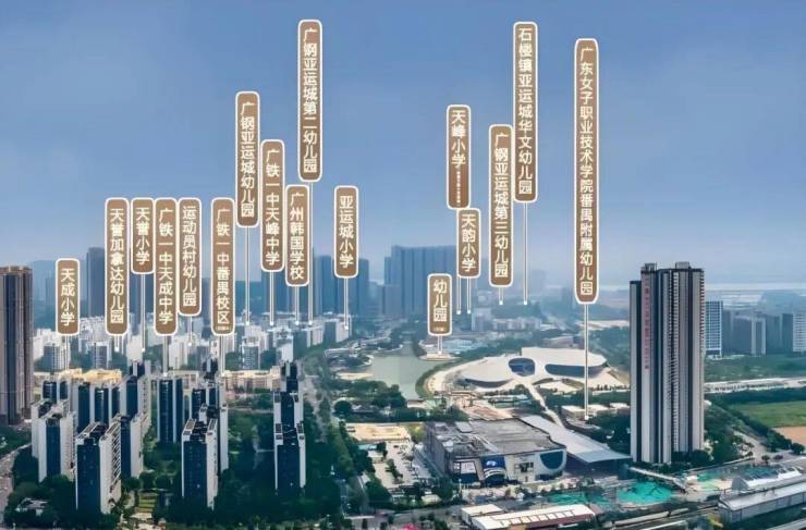 教育资源是中海亚运城的一大亮点。项目规划了 19 所全龄学府,涵盖幼儿园到高中,其中 4 所广铁一中已开学。广铁一中天成校区在 2021 年中考成绩位居番禺区属第一,高考高优率达 93%,家长可轻松实现 “目送式入学”。目前已有 18 所学校投入使用,1 公里范围内分布着 13 所学校,孩子步行即可上学,省去了长途通勤的烦恼。