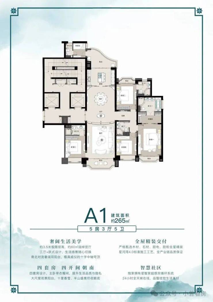265.97㎡的 5 室 5 卫户型更是有着阔绰的空间尺度,搭配社区台地式园林景观,北向能望香雪公园,南向可瞰中心水景,视野开阔无遮挡。