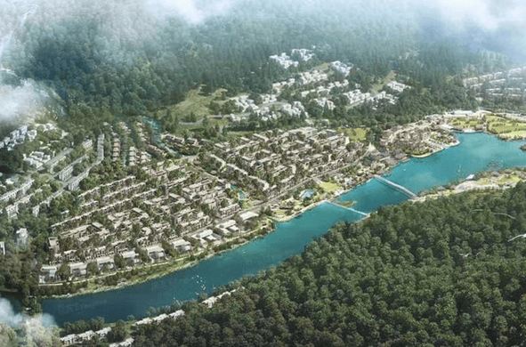 项目定位湾区首个深度休闲度假首选目的地,以“一个人的精神湾区”为规划理念,利用美学营造乌托邦式社群化群居度假生活山谷。项目总建筑面积120万㎡,容积率1.0,绿地率30%,沿河坡地展开,以弯区稀缺产品叠墅与平墅为主,建筑立面现代简洁,色调以卡其色、米白色为主,点缀深灰,呈现当代艺术感,布局结合地形,错落有致、高低跌宕。小镇内部规划酒店、餐饮、文化、儿童与休闲娱乐等多元化功能业态,为湾区人提供“城市-山谷”双线程自由切换的生活体验。