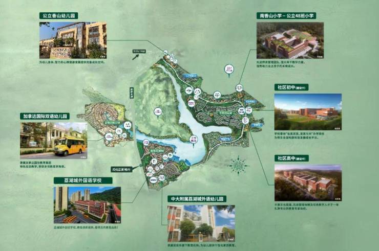 项目北面靠南香山,东面看荔湖城的湖景高尔夫,南面看公园上城湖景,西面为别墅区。