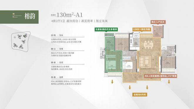 建面约130㎡,8 米的 L 型阳台,视野开阔。四开间朝南,餐厅打造全景飘窗,实现南北对流,通风效果极佳,室内空气清新。