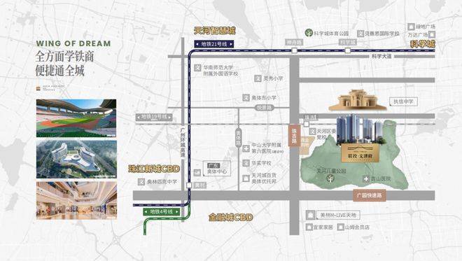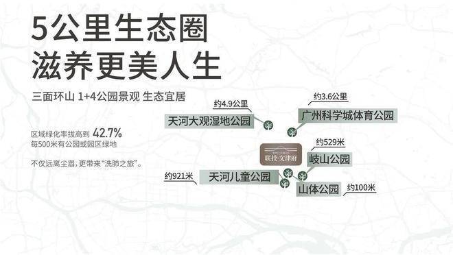 外揽“1+4公园”:山体公园、天河区儿童公园、岐山公园、天河大观湿地公园、广州科学城体育公园