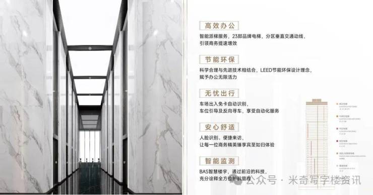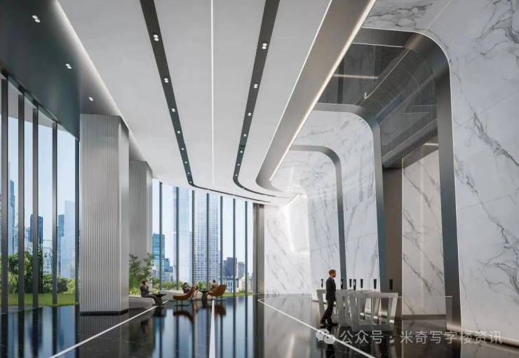 项目大堂采用意大利进口云纹石材,以三维冷弯工艺雕琢成环绕建筑的时光幕帘。32°倾斜穹顶设计,让晨光在中庭洒落不断变幻的光瀑。南入户大堂外规划引进新派咖啡厅,融合商务社交与办公需求于一体。