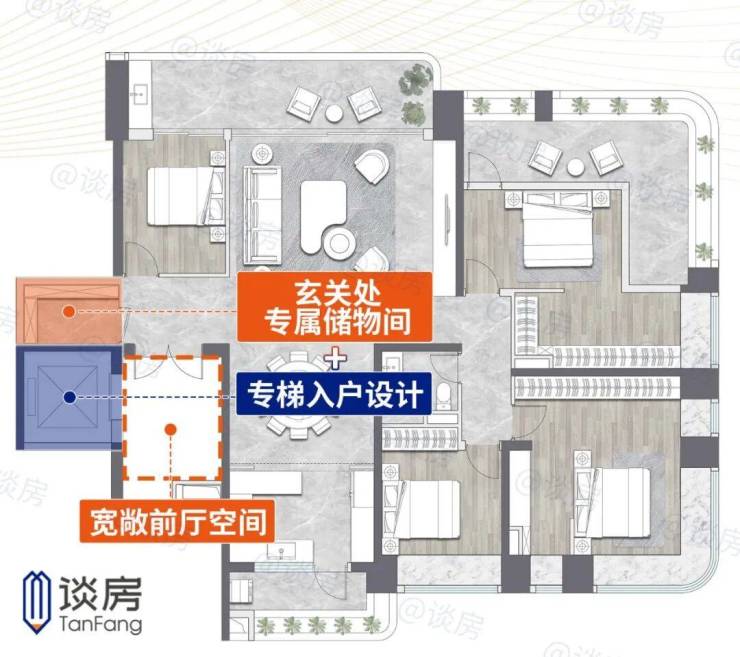 我惊喜发现,专梯入户竟是每户标配。这意味着敞阔的前厅空间可为已所用,鞋柜、换鞋凳一一安排!