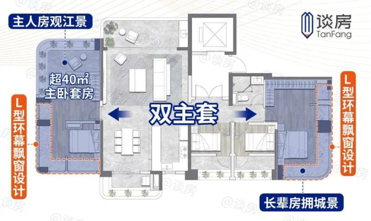 南向双主套均打造了L型环幕飘窗,主卧套房望开阔珠江,南北通透,长辈套房的日常起居,有繁华城景作伴。