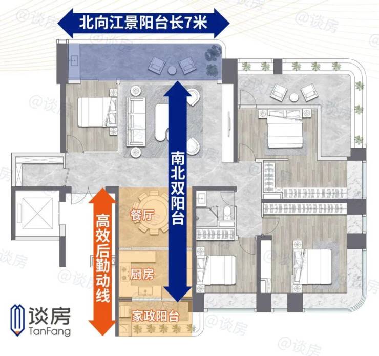又如南北双阳台,北向阳台为休闲娱乐空间,南向家政阳台和厨房、餐厅相连,形成高效便捷的后勤动线。