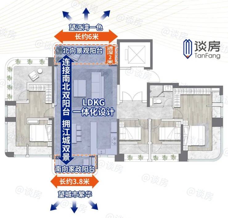 LDKG一体化客厅公区,连接南北双阳台,南向家政阳台望城市繁华,北向景观阳台赏江湾一色。