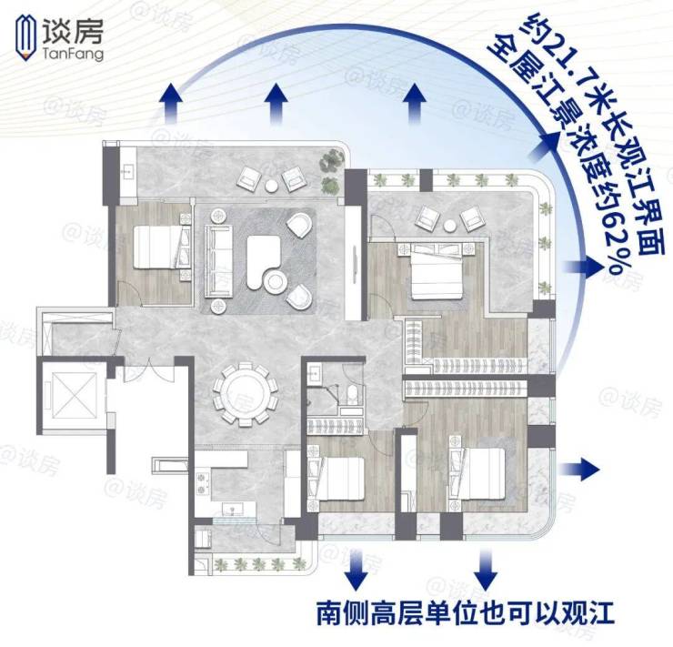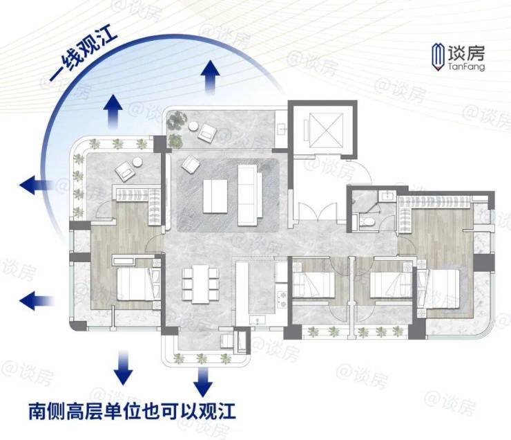 更绝的是,高层单位南侧也能看江,全屋被江景包围,堪称全景舱!