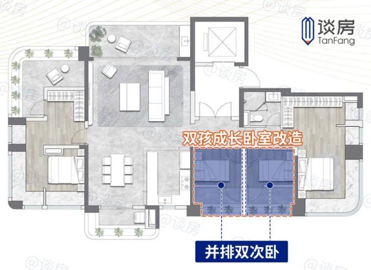 中间并排双次卧,可打通改为一个大空间,两娃小时一起生活,方便家长照看,长大后拥有专属独立空间,生活上互不相扰。