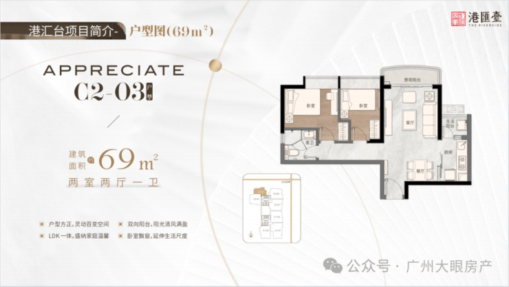 69㎡双阳台两房两厅一卫,户型方正,灵动百变空间,LDK一体,盛纳家庭温馨,双向阳台,阳光清风,视野开阔,全飘窗设计,增加室内利用空间