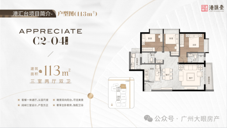 113㎡三房两厅两卫,阔绰三室设计,户型方正,釆光面广,瞰景双向阳台,尽览美景,奢享主卧套房,独配卫浴