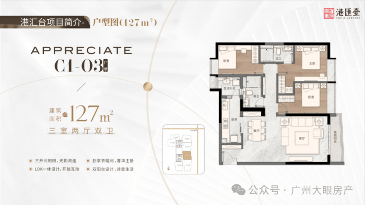127㎡三房两厅两卫,三开间朝阳,釆光景观无遮挡,LDK一体设计,开放互动,大开间设计,释放更大的活动空调,双阳台设计,诗意生活