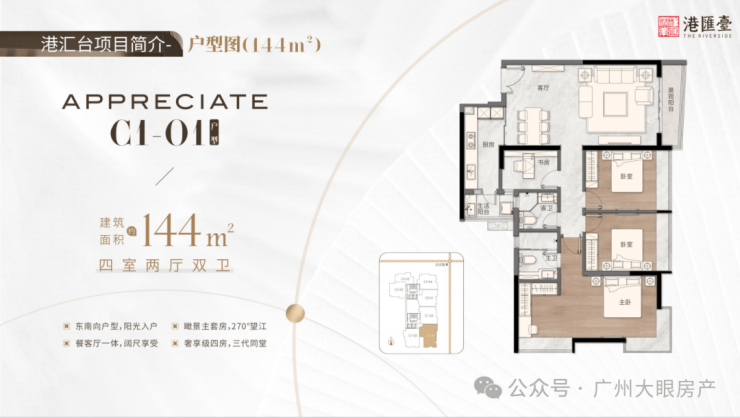 144㎡四房两厅二卫,东南向户型,阳光入户,瞰景主套房,270度望江,餐客厅一体,阔尺享受,奢享级四房,三代同堂