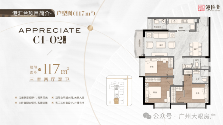 117㎡三房两厅两卫,阳台飘台视野广,无界风光,主卧奢配衣帽间,私藏优雅双阳台向阳,美景釆光入室,客卫三分离设计,井井有序