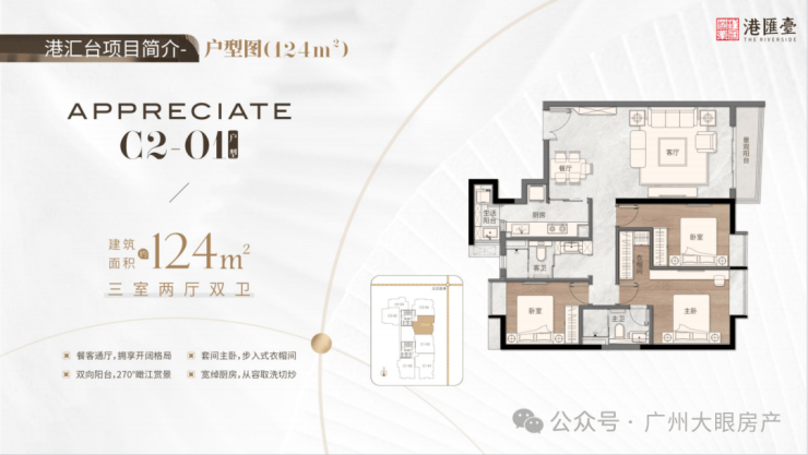 124㎡三房两厅两卫,餐客通厅,拥享开阔格局,套间主卧,步入式衣帽间,双向阳台,270度瞰江赏景,宽绰厨房,从容取洗切炒