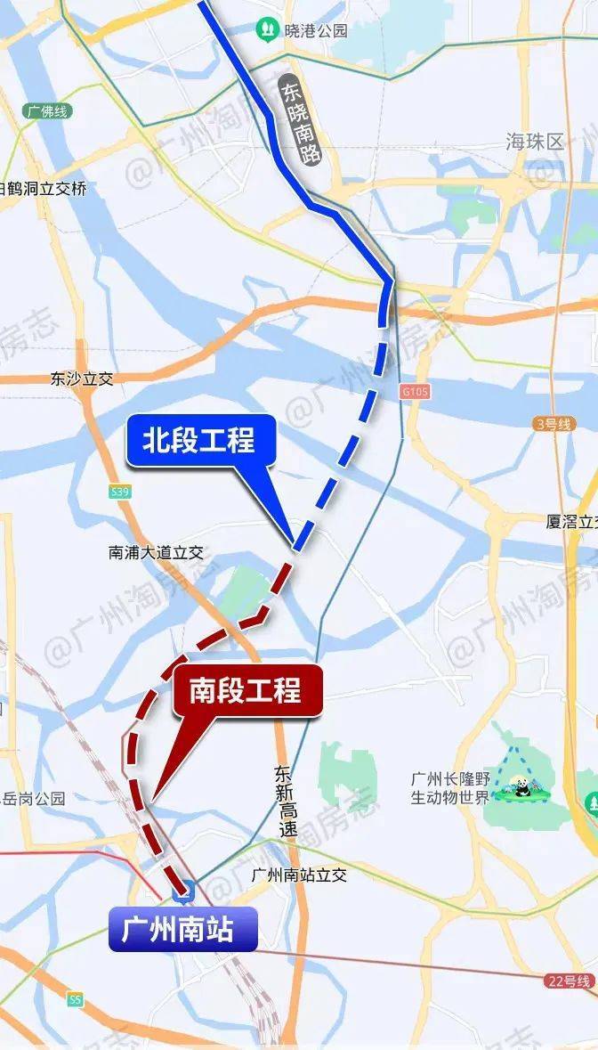 东晓南放射线,东晓南路至广州南站连接线全长约9.5公里,路线整体呈南北走向,由南段工程和北段工程组成,意义在于加强广州主城区与广州南站的直接联系;采用城市快速路标准,双向六车道,设计速度为80公里/时。