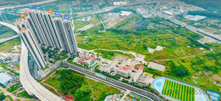 项目主要是分为北区和南区开发,上图的左边是北区,右边是南区,两区中间是配建的幼儿园和9年制广外附学校,地铁站口和商业主要集中在南区楼下。
