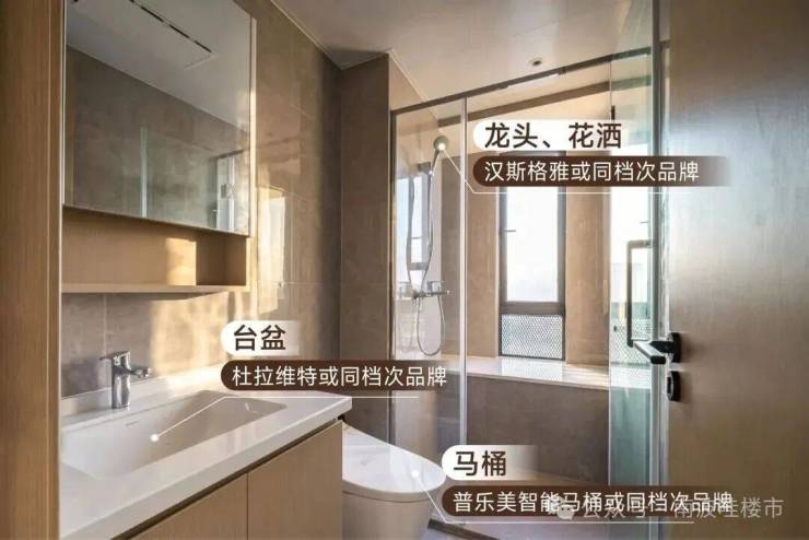 坚持“高端精品”产品信条,采用全屋智能马桶、凉霸、暖风机、杜拉维特(或同档次品牌) 卫浴台盆、汉斯格雅(或同档次品牌)淋浴花洒等知名品牌交标,全屋精装交付标准拔升人居新高度,筑就城市人居名片。