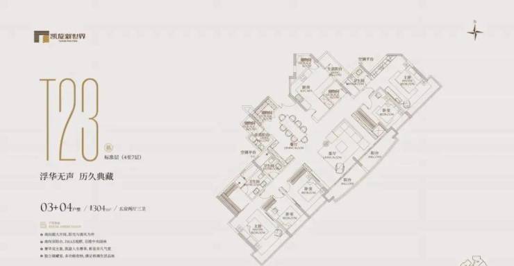 面积为304㎡,分布在t23栋的3-8层及t17栋的3-26层,2梯3户或2梯4户,有五房两卫或五房三卫。