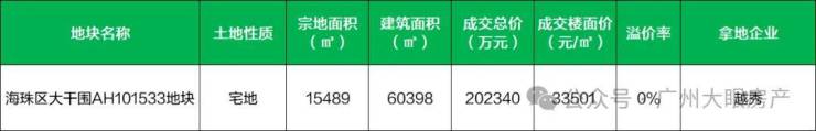 2024年12月23号,海珠大干围地块被越秀以20.23亿元拿下,楼面价为33501元/㎡。
