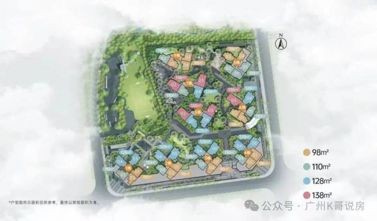 有三个面积段,98-110-128㎡三至四+1房,共有5个户型,都是新规设计,实用率达100%以上。