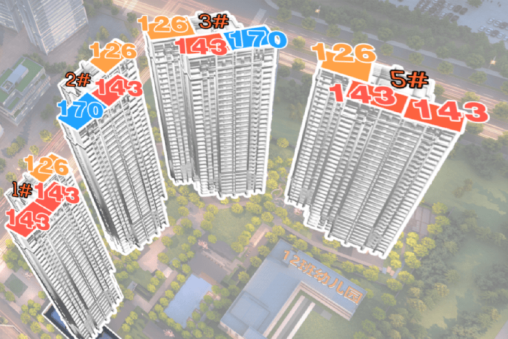 中海麓府体量不大,仅4栋住宅,40多层高的住宅(1#高40层,2-3#高44层,5#高41层),两梯三户,底下规划有1所12班幼儿园+1栋自持物业,货量在500套上下,它的面积段有三种,分别是建面约126㎡三房、143㎡和170㎡的四房